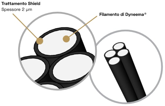 “Shield” is the name given to a specific unifilar impregnation treatment applied to the Dyneema® fiber by using a very special protective coating that creates a kind of “Shield” all around the pure fiber.